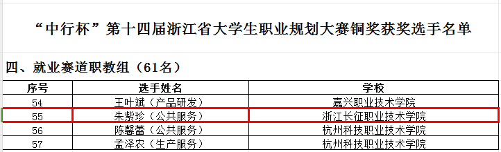 近日,“中行杯”第十四届浙江省大学生职业规划大赛获奖情况公布,我校朱紫珍同学荣获就业赛道职教组铜奖(指导教师:蒋雪芹)。