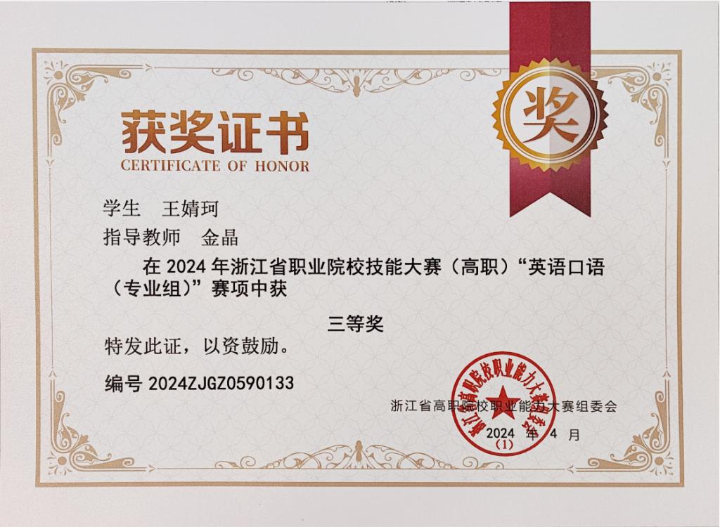 近日,2024年浙江省职业院校技能大赛高职组“英语口语”赛项在绍兴职业技术学院举行,来自全省49所高职院校的156名选手同台竞技。经过激烈角逐,我校管理学院王欣然同学(指导老师:许贞贞)和商务与贸易学院王婧珂同学(指导老师:金晶)荣获专业组三等奖。
