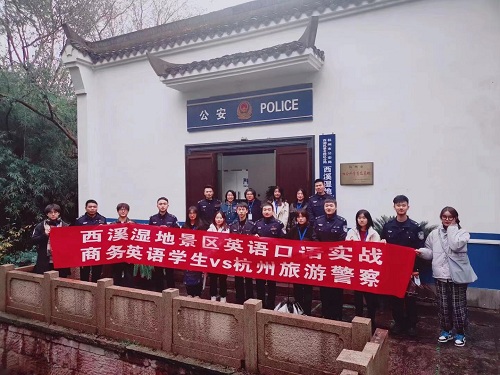 2020年11月25日下午,我校应用语言系商务英语专业与杭州市公安局西湖风景名胜区分局联合组织的“西溪湿地景区英语口语实战”活动在杭州西溪湿地举行,我校金晶老师,商务英语专业的10名学生以及杭州市公安局西湖风景名胜区分局的10位旅游警察参加活动。