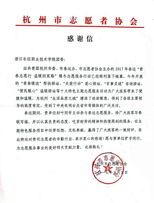 近日,杭州市志愿者协会给我院发来感谢信,感谢我院封叶同学(16级会计专业学生)主动参与由共青团杭州市委、市春运办、市志愿者协会主办的2017年春运“青春志愿行 温暖回家路”暖冬志愿服务行动。