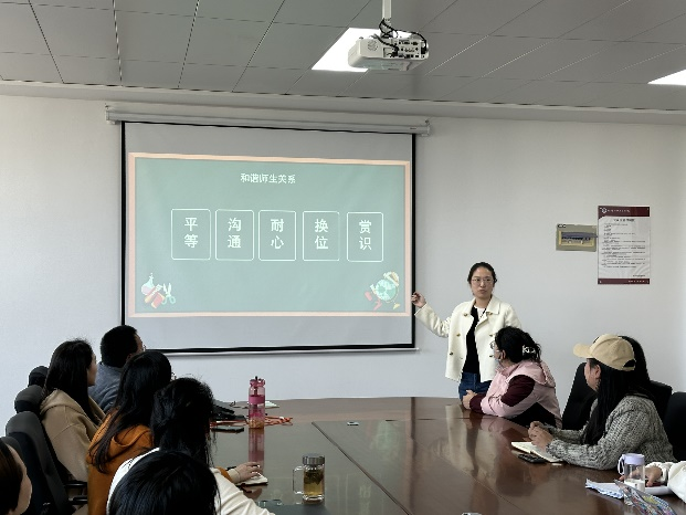 曾获学校“优秀党员”荣誉称号,深受学生喜爱的叶子杨老师结合自己与学生沟通交流的亲身经历与大家进行了分享。她提出,构建和谐师生关系首先要坚持平等、沟通、耐心、换位、赏识的原则。对于如何有效与学生沟通,她表示,一是多渠道连接,打破沟通的壁垒;二是制造“邂逅”机会,让教育无处不在;三是寻找共同话题,培养共同兴趣。